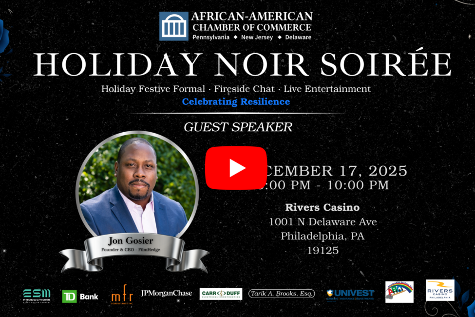 On December 17, 2025, the African American Chamber of Commerce of Pennsylvania, New Jersey, and Delaware hosted a Fireside Chat during its Holiday Noir Soirée at Rivers Casino in Philadelphia. The discussion featured Jon Gosier, Founder and CEO of FilmHedge, with moderation by Matthew Stitt, President of PFM Group Consulting LLC. This engaging conversation explored…